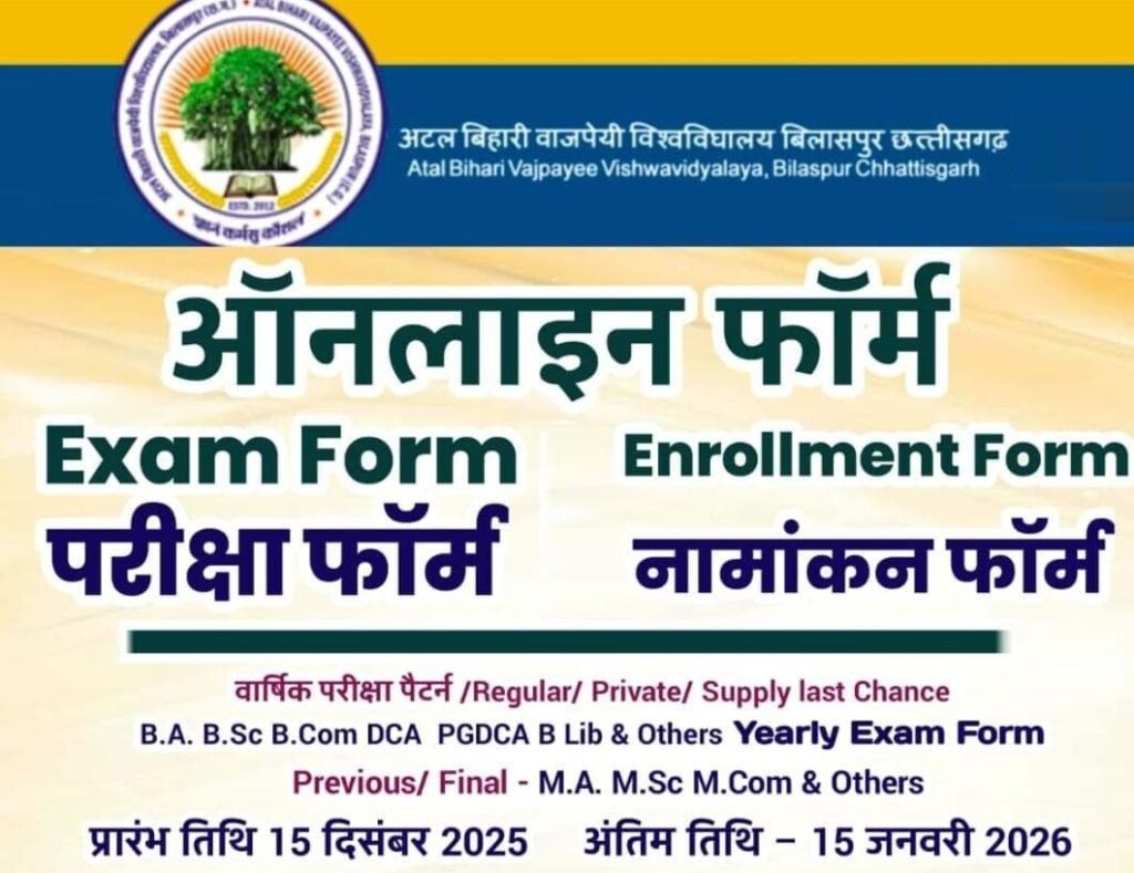 प्रश्न: अटल बिहारी वाजपेयी विश्वविद्यालय बिलासपुर परीक्षा/नामांकन फॉर्म 2026 कब से शुरू हुए हैं?
