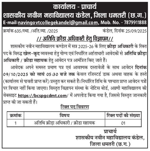 Atithi Krida Adikari Bharti CG शासकीय नवीन महाविद्यालय कण्डेल जिला धमतरी (छ.ग.) में सत्र 2025-26 के लिए क्रीडा अधिकारी के रिक्त पद के विरुद्ध खेल-कूद व्यवस्था हेतु योग्य एवं निर्धारित अर्हताधारी आवेदकों से अतिथि क्रीडा अधिकारी / क्रीडा सहायक हेतु आवेदन पत्र दिनांक 09/10/2025 को सायं 05:30 बजे तक आमंत्रित किया जा रहा हैं। इक्छुक आवेदक अपने समस्त प्रमाण पत्र एवं आवश्यक दस्तावेजों के साथ आवेदन दिनांक 09/10/2025 को सायं 05:30 बजे तक केवल रजिस्टर्ड डाक अथवा वाहक के हस्ते (कार्यालय से पावती प्राप्त करें) प्रस्तुत कर सकते हैं। निर्धारित तिथि के पश्चात प्राप्त आवेदन पत्रों पर विचार नहीं किया जाएगा। विस्तृत विज्ञापन संस्था के नोटिस बोर्ड, अग्रणी महाविद्यालय की वेबसाइट https://bcspgcdmt.com/ में अपलोड किया गया है, जिससे विस्तृत जानकारी प्राप्त की जा सकती हैं। यह सूचना कार्यालय प्राचार्य शासकीय नवीन महाविद्यालय कंडेल, जिला धमतरी (छ.ग.) द्वारा जारी किया गया है
