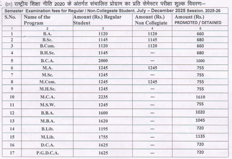 - राष्ट्रीय शिक्षा नीति(NEP) 2020 के अंतर्गत संचालित पाठ्यक्रम का प्रति सेमेस्टर परीक्षा शुल्क विवरणः-