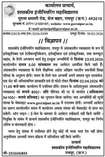 GEC Raipur Recruitment 2026, Government Engineering College Raipur Jobs, Teaching Jobs Chhattisgarh, Engineering Lecturer Vacancy, Raipur Job Updates 2026, Sarkari Naukri Raipur, AICTE Faculty Recruitment, Chhattisgarh Higher Education Jobs, GEC Raipur Career, Assistant Professor Vacancy CG