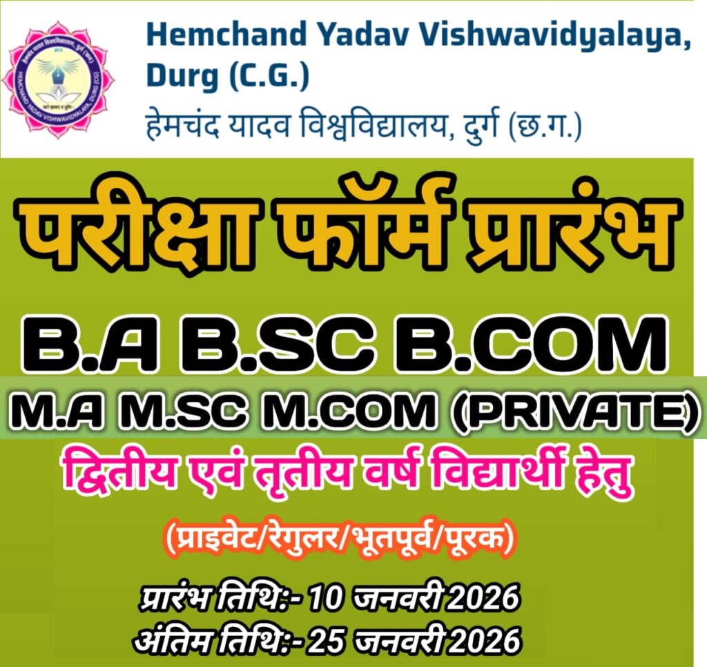 उत्तर: हेमचंद यादव विश्वविद्यालय दुर्ग द्वारा शैक्षणिक सत्र 2025-26 की मुख्य (वार्षिक) परीक्षा 2026 हेतु ऑनलाइन परीक्षा आवेदन 10 जनवरी 2026 से प्रारंभ हो रहे हैं।