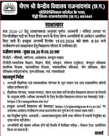 1 thought on “PM SHRI KVS Rajnandgaon Recruitment 2026: केंद्रीय विद्यालय में शिक्षक बनने का सुनहरा मौका, बिना परीक्षा सीधी भर्ती”