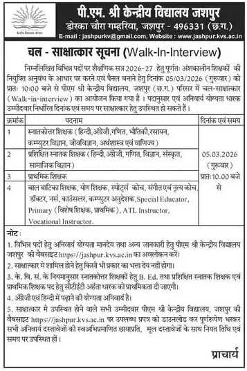 KVS Jashpur Recruitment 2026, PM Shri Kendriya Vidyalaya Jobs, Chhattisgarh Teacher Vacancy 2026, Walk-in-Interview Jashpur, KVS Contractual Teacher Salary, CG Education News, PGT TGT Vacancy Jashpur, Central School Jobs Chhattisgarh, Sarkari Naukri Jashpur, CTET Qualified Jobs 2026